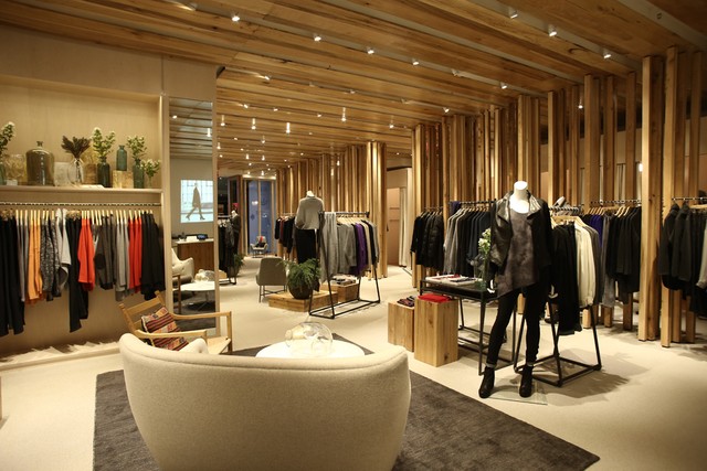 This project included high degree of custom work in reclaimed items and working with fashion designers and artisans. Reclaimed barn wood is used throughout the store, from the ceilings to wooden pedestals, to give a warm and inviting feel. Benches in the dressing rooms are made of 300-year-old heart pine derived from old buildings. During the demolition of the previous space, existing materials were sorted and recycled or salvaged wherever possible to limit landfill waste. Further, no toxic glues were used, and all the paints and finishes have low volatile organic compound so the store doesn’t smell like a new store. In addition, Dolphin installed in the store energy-efficient LED bulbs to minimize energy consumption.